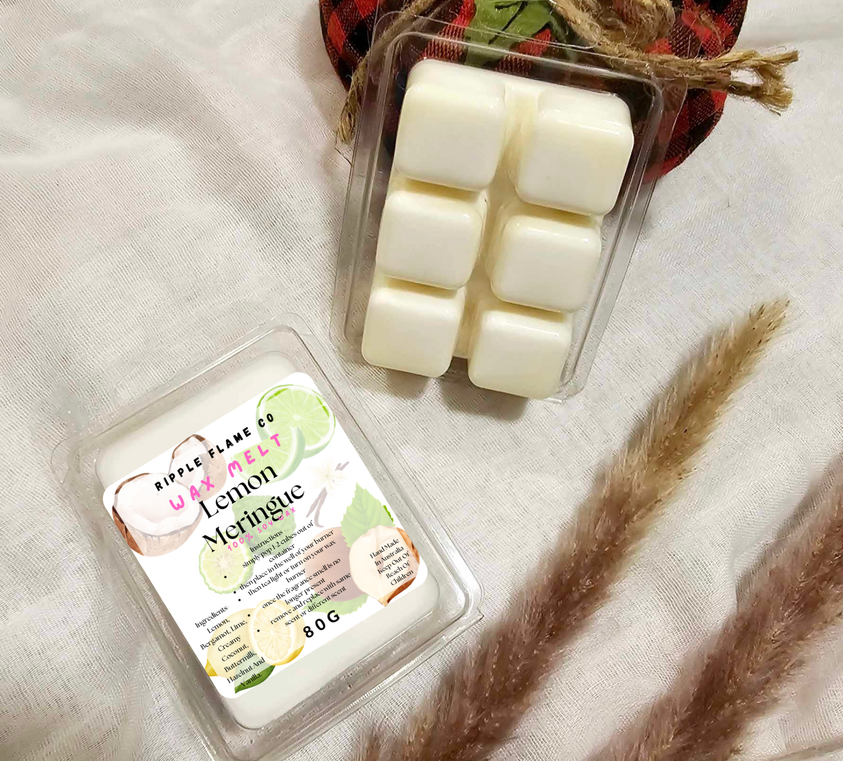 Each soy wax melt is 80 grams and 100% Soy wax. All soy wax melts may vary in colour slightly.